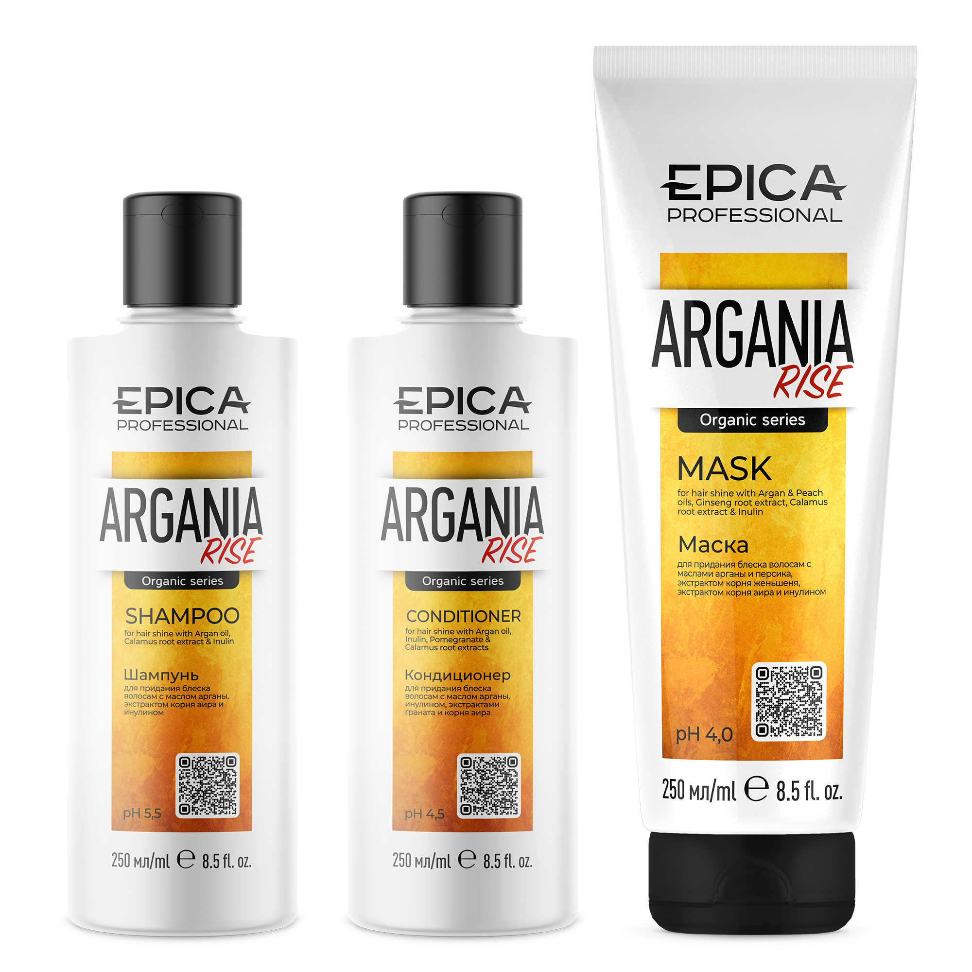 Набор Epica Argania Rise создан для ухода за тусклыми, ослабленными волосами. Включает шампунь, кондиционер и маску, которые придают локонам силу и блеск. Объем всех средств – 250 мл.